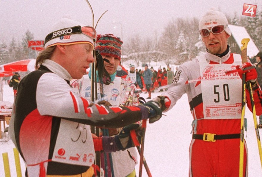 Národný vytvalostný beh na lyžiach - Biela stopa SNP Kremnica - Králiky 14. februára 1999. Na snímke druhý v hlavnej kategórii Radoslav Zima zo Štrbského Plesa gratuluje víťazovi Romanovi Matějkovi z Dukly Liberec (ČR, vľavo).
