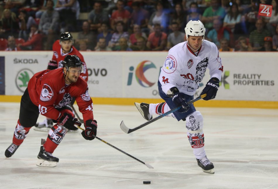 Na snímke zľava Ivan Ďatelinka (Banská Bystrica) a Richard Lintner (Výber hviezd) počas exhibičného zápasu - spomienka na Miroslava Hlinku HC ´05 iClinic Banská Bystrica - Výber hviezd 31. júla 2015 na zimnom štadióne v Banskej Bystrici.