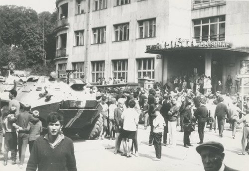 Demonštrujúci a obrnená technika pred budovou pošty v Banskej Bystrici. Ján Kučerák. (ÚPN)