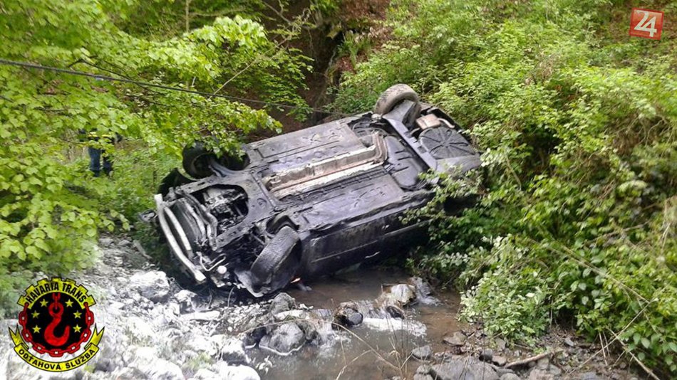 Galéria k článku Nehoda v Šášove: Auto s tromi ľuďmi skončilo na streche v potoku, FOTO