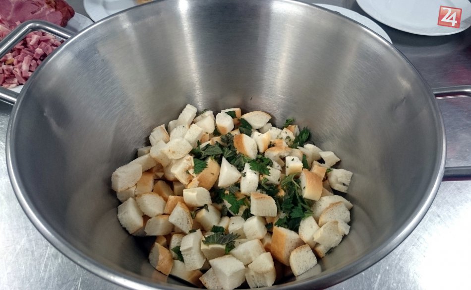 Pečivo a údené mäso si nakrájame na malé kocky. Všetky nakrájané suroviny spolu s hrubšie nasekanou žihľavou dáme do nádoby.
