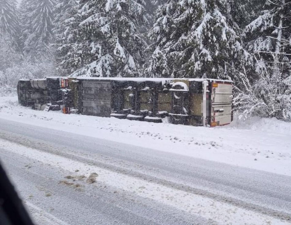 Galéria k článku Kamión viezol 23 ton citrónov: Skončil prevrátený na Kremnických Baniach, FOTO
