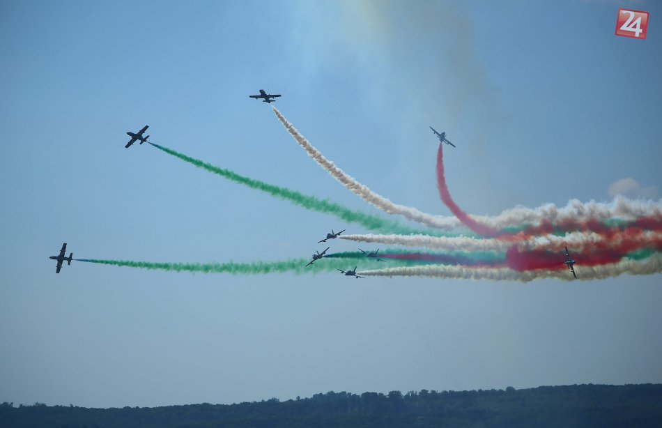 Na snímke predstavenie talianskej akrobatickej letky Frecce Tricolori počas Medzinárodných leteckých dní SIAF 2015 na leteckej základni Sliač 29. augusta 2015.