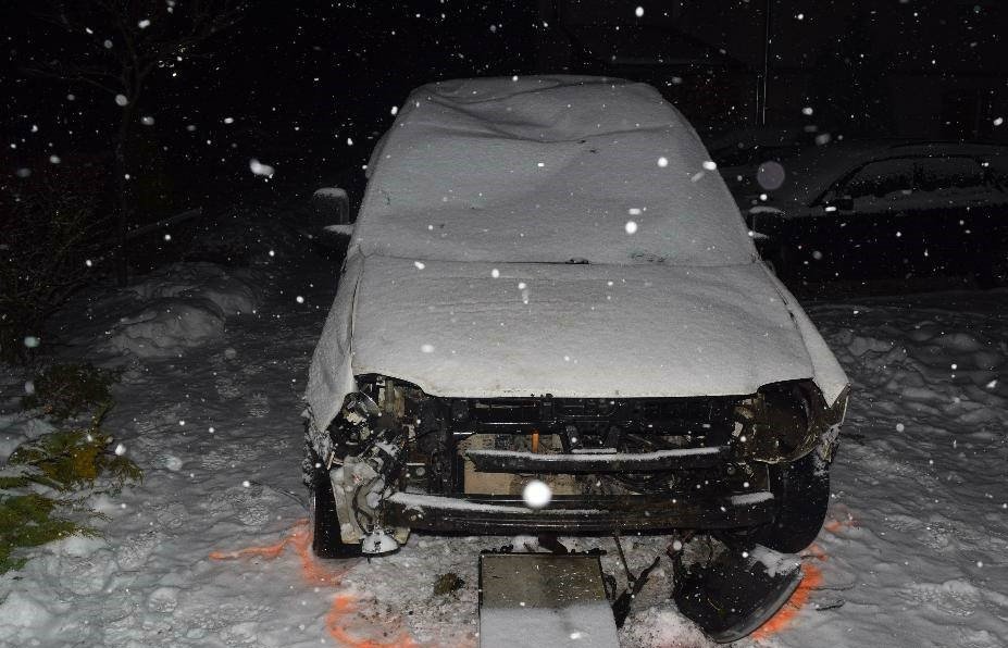 Galéria k článku Vodič pri Žarnovici podcenil sneh: Zrámoval značku, stĺp aj plot, FOTO
