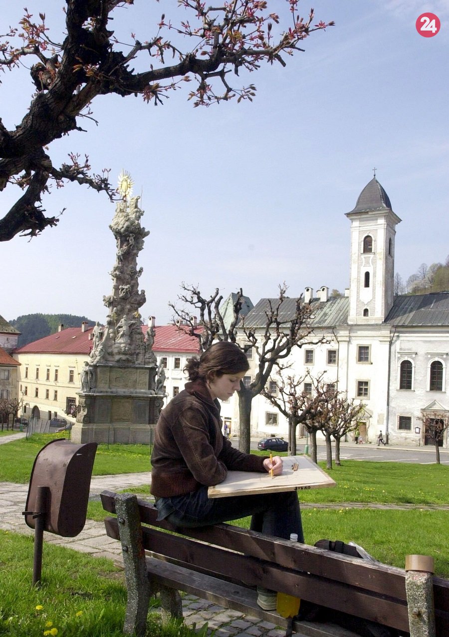 Rok 2004. Na snímke poslucháči 1. ročníka Školy úžitkového umenia v Kremnici kreslia na námestí.