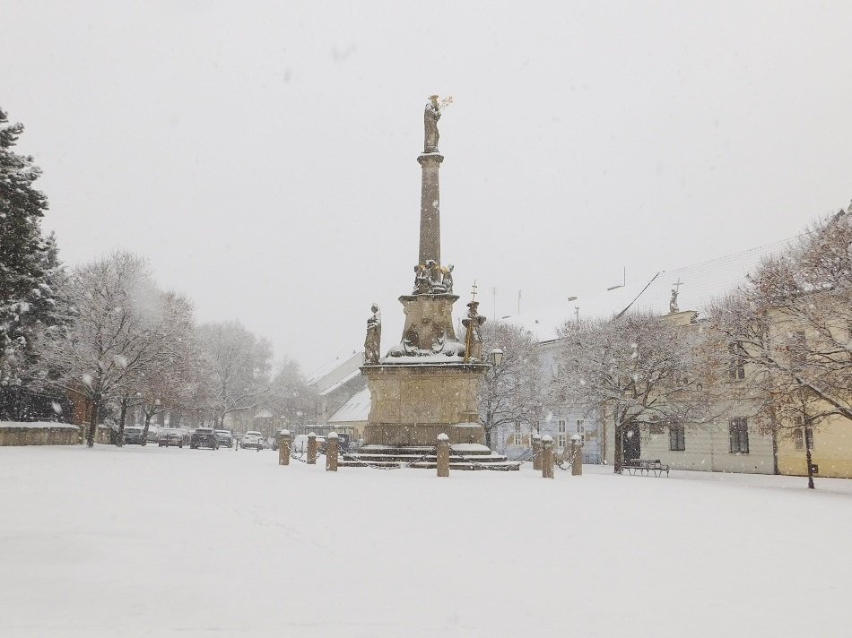 Na Námestí sv. Mikuláša v Trnave pred morovým stĺpom.