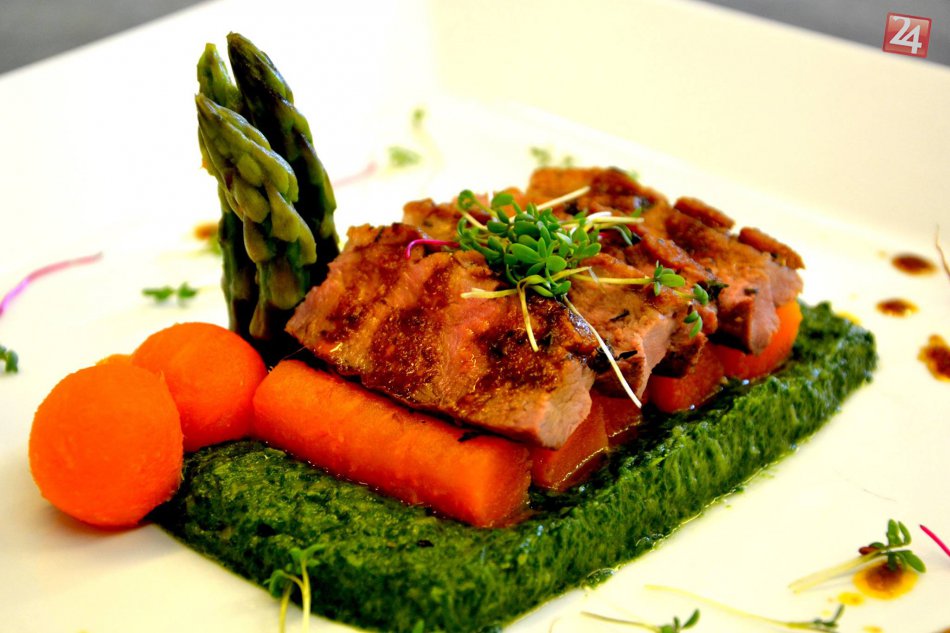 Kačacie prsia so špenátom s citrón. trávou, maslovými batatovými zemiakom a špargľou, Marek Trangoš