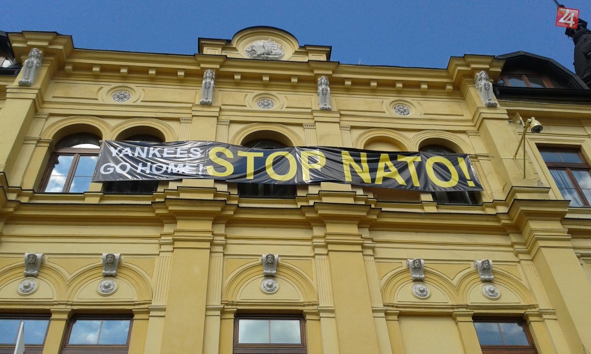 Galéria k článku Župná budova v deň osláv SNP púta pozornosť: Visí na nej transparent Stop NATO!