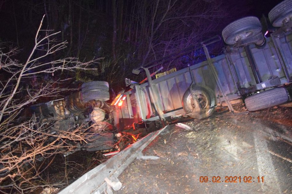 Galéria k článku Pri Bystrici došlo k hrozivo vyzerajúcej nehode: Kamión sa prevrátil na bok, FOTO
