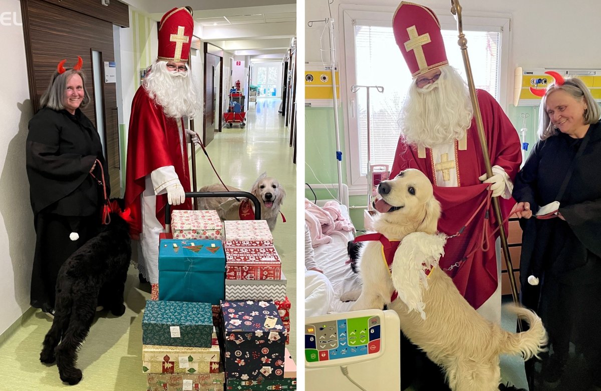 Galéria k článku Mikuláš potešil pacientov s NEVŠEDNÝMI pomocníkmi: ANJEL s ČERTOM mali 4 nohy, FOTO