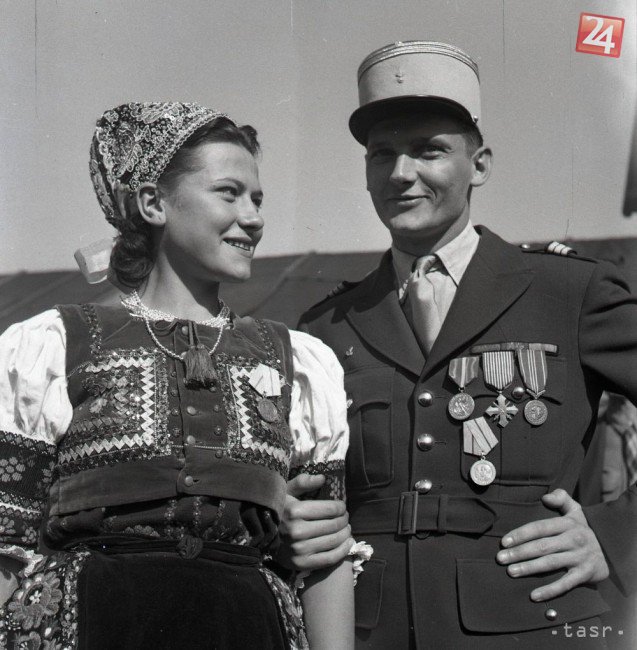 Oslavy prvého výročia celonárodného povstania v Banskej Bystrici. Veliteľ francúzskych partizánov na Slovensku kapitán Georges Barazer de Lannurien a slovenská partizánka po dekorovaní pamätnou medailou, 29. augusta 1945