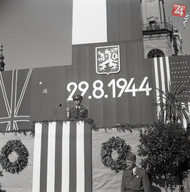 Oslavy prvého výročia celonárodného povstania v Banskej Bystrici. Podpredseda Slovenskej národnej rady pplk. Milan Polák pri prejave, 29. augusta 1945