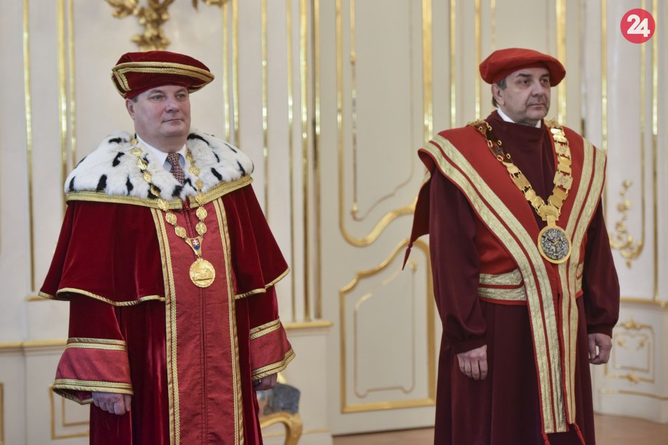 Na snímke zľava znovuvymenovaný rektor Technickej univerzity vo Zvolene Rudolf Kropil, novovymenovaný rektor Akadémie umení v Banskej Bystrici Michal Murin počas vymenovania rektorov vysokých škôl prezidentkou SR Zuzanou Čaputovou.