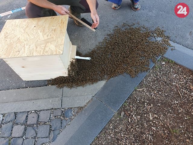 Galéria k článku Zvolenskí mestskáči zažili nevšednú akciu: Na námestí sa usídlil roj včiel, FOTO