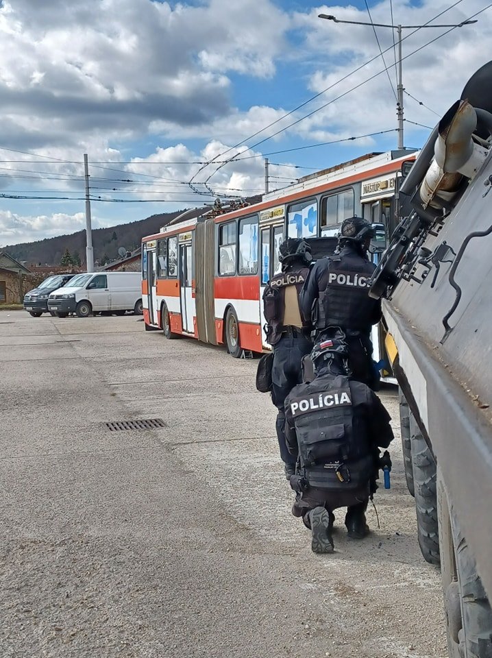 Galéria k článku Rukojemnícka DRÁMA v bystrickom trolejbuse: Pri CVIČENÍ zasahovali kukláči i vyjednávači, FOTO