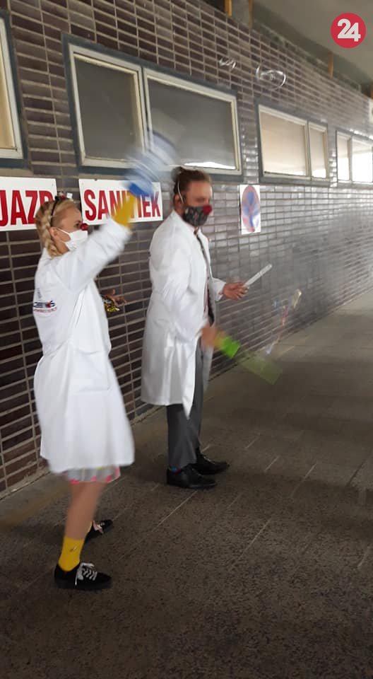 Galéria k článku Klauni bavia deti pred bystrickou nemocnicou: Teplotu merajú vskutku originálne, FOTO