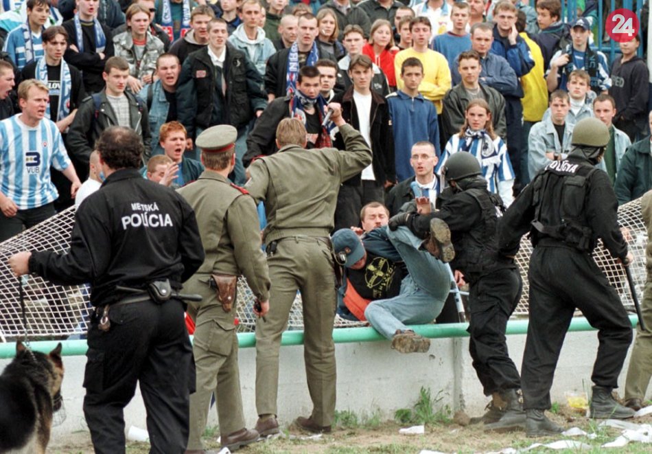 8. máj 1999 - Finále Slovenského pohára, Slovan vs. Banská Bystrica na štadióne v Žiari. Na fotke je zásah polície v tábore fanúšikov Slovanu po demolácii plotu.