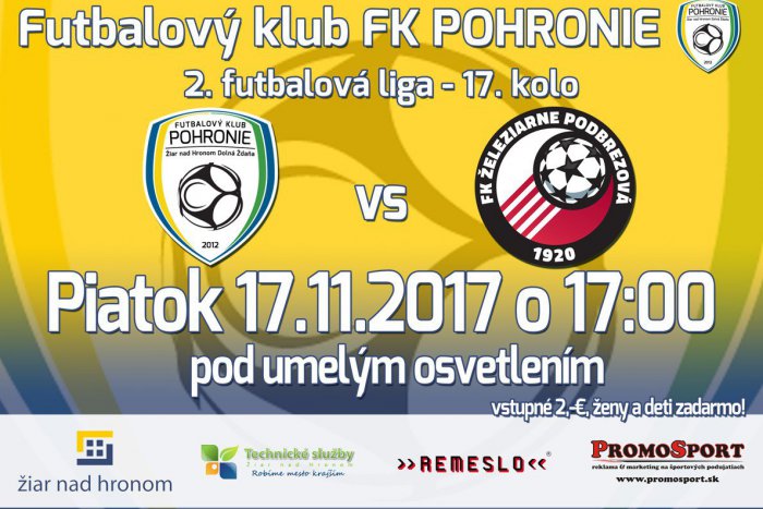 Už tento piatok (17.11.) o 17:00 hod. privítame na žiarskom futbalovom štadióne súpera z chvosta tabuľky, FK Železiarne Podbrezová „B“. Ako si už fanúšikovia pri podvečerných stretnutiach zvykli, zážitok umocní umelé osvetlenie.