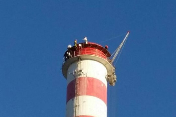 Oči okoloidúcich sa dvíhali k oblohe. Okolo 130 metrov vysokého priemyselného komína krúžil vrtuľník. Jeho úlohou bolo pomáhať pri rekonštrukcii.